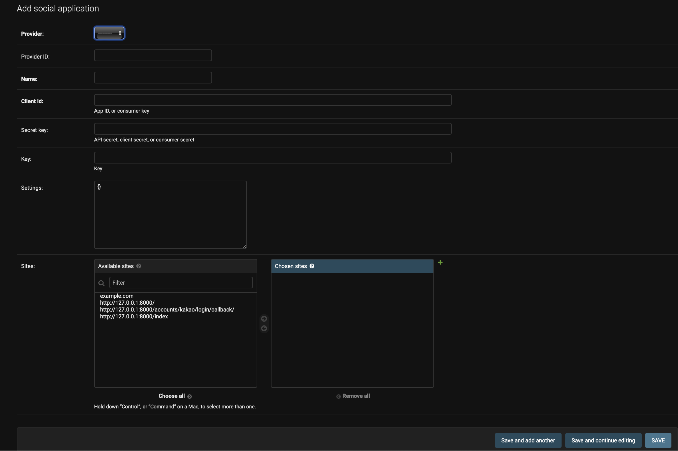 6. sites -> 아까 추가로 적은 두 개를 선택해서 등록해주시면 됩니다.