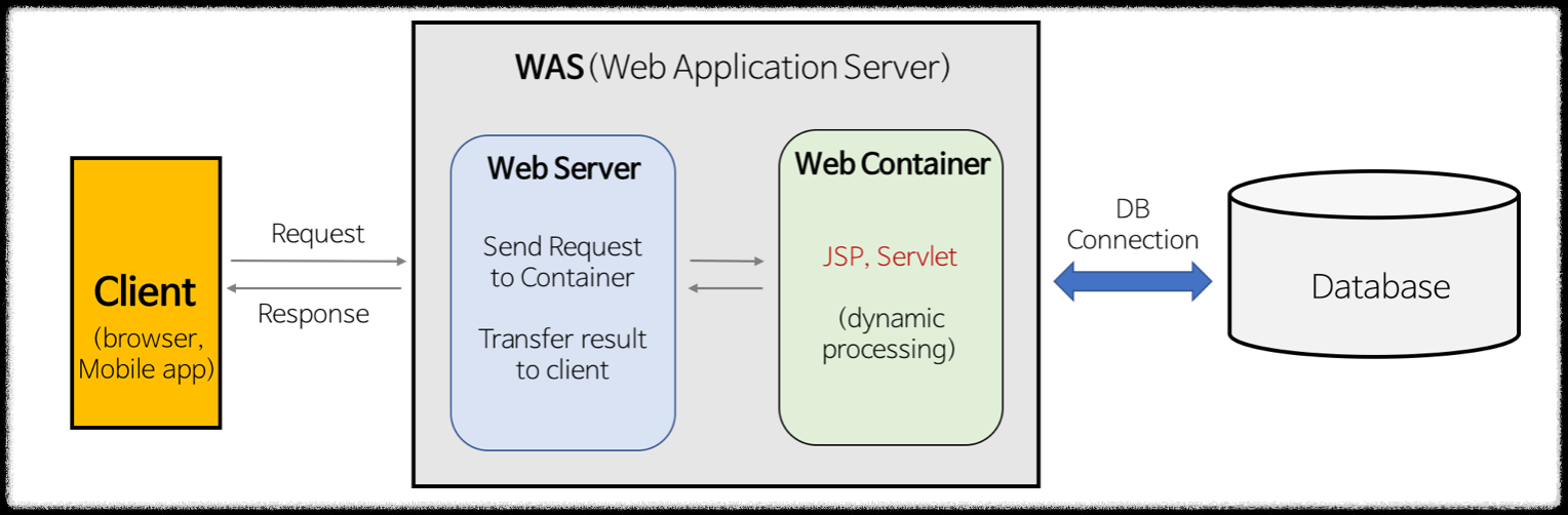웹 서버는 정적 컨텐츠를 제공하는 서버이고, WAS는 동적 컨텐츠를 제공하기 위해 만들어진 Application 서버임.