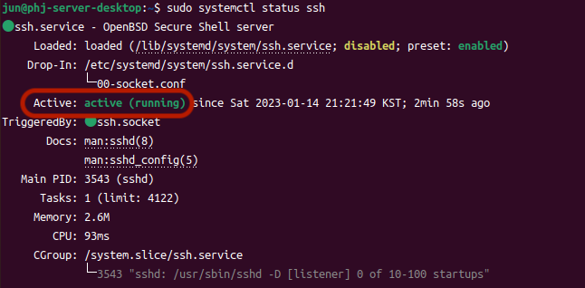 만약 실행 중이 아니라고 한다면 아래 명령어를 입력합니다. 그 후 ssh status 상태 명령어를 입력하면 실행되는 것을 볼 수 있습니다.
